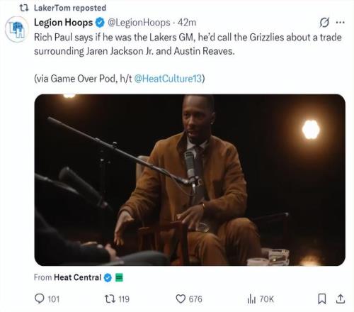 湖媒laker Tom转发里奇-保罗的言论后写道:3J是我愿意用里夫斯交易的几位球员之一,小贾伦可以完美取代勒布朗-詹姆斯大前锋的位置,今夏湖人队还可以签下沃克-凯斯勒组建一套顶级的双高阵容。