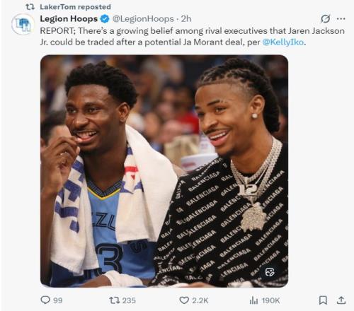 北京时间1月13日,根据NBA记者凯利-伊科的报道,孟菲斯灰熊队已经决定开启全新的未来,他们有意在交易掉莫兰特后再交易小贾伦-杰克逊。